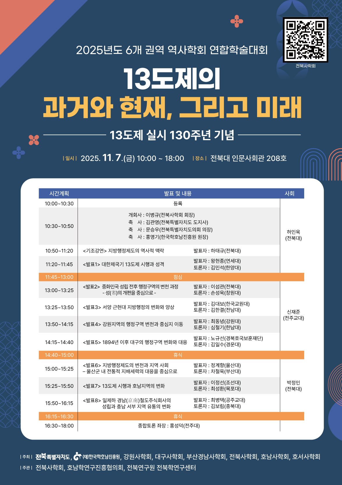 6개 권역 역사학회 연합학술대회, "13도제의 과거와 현재, 그리고 미래"개최(11/7 금)