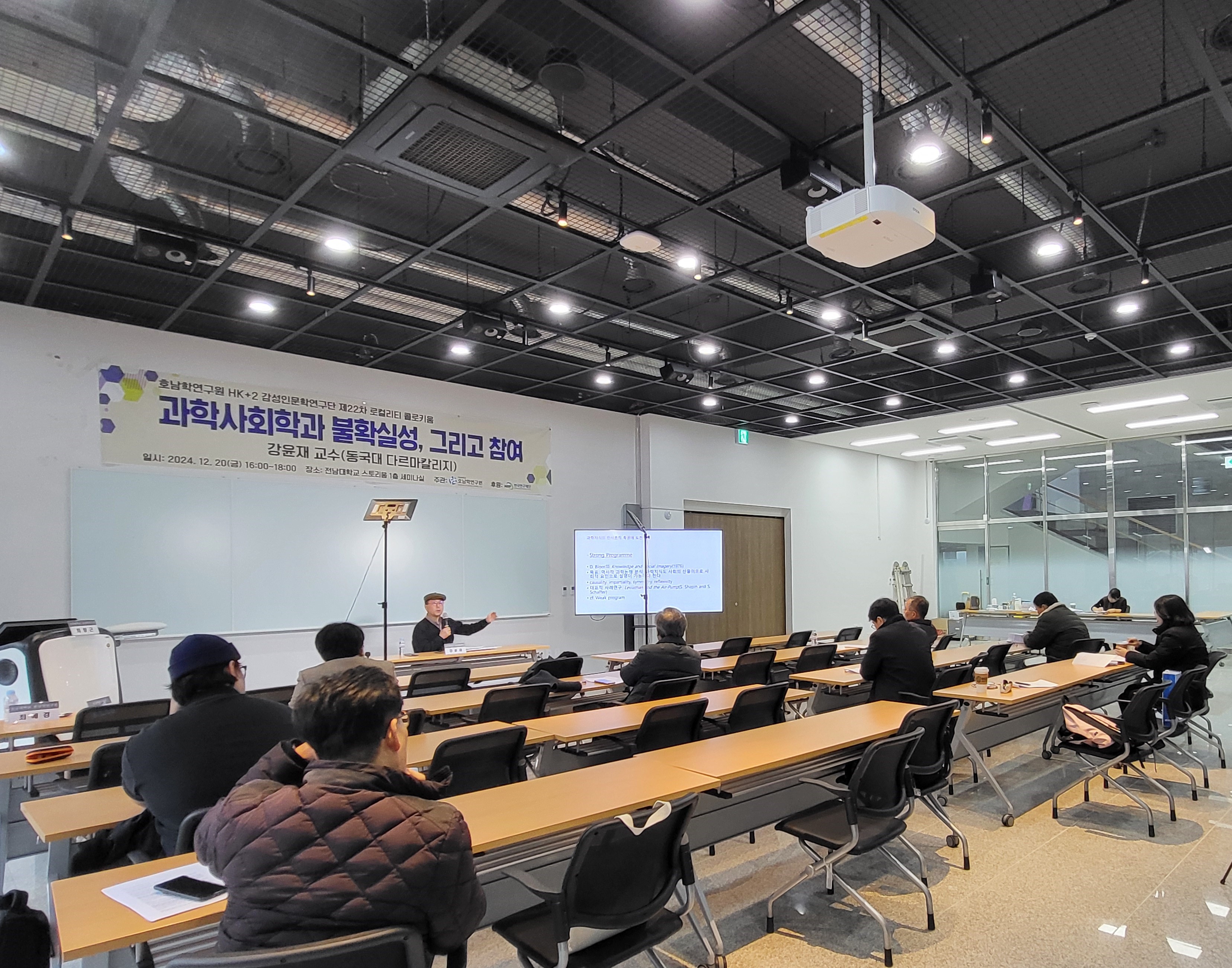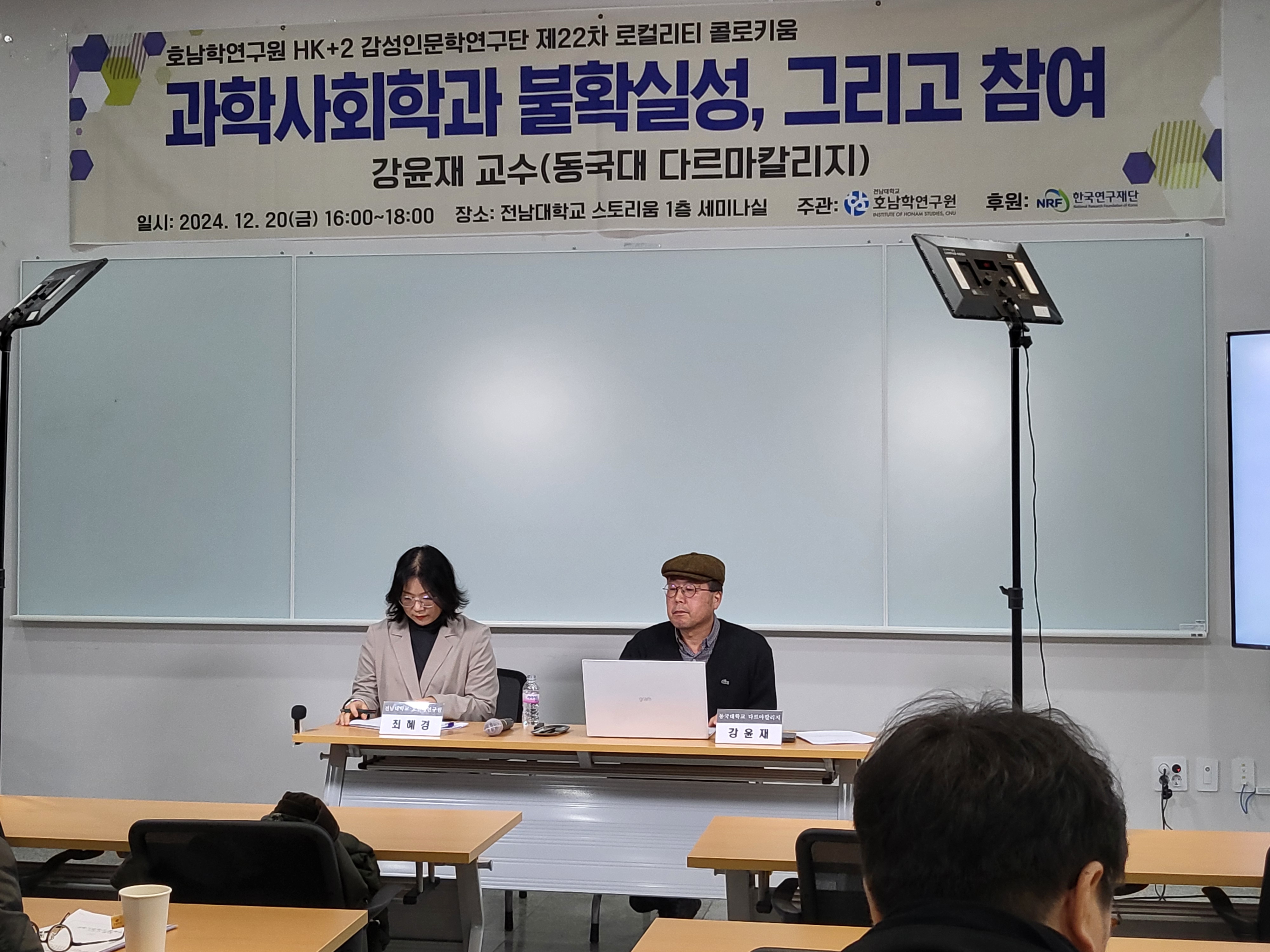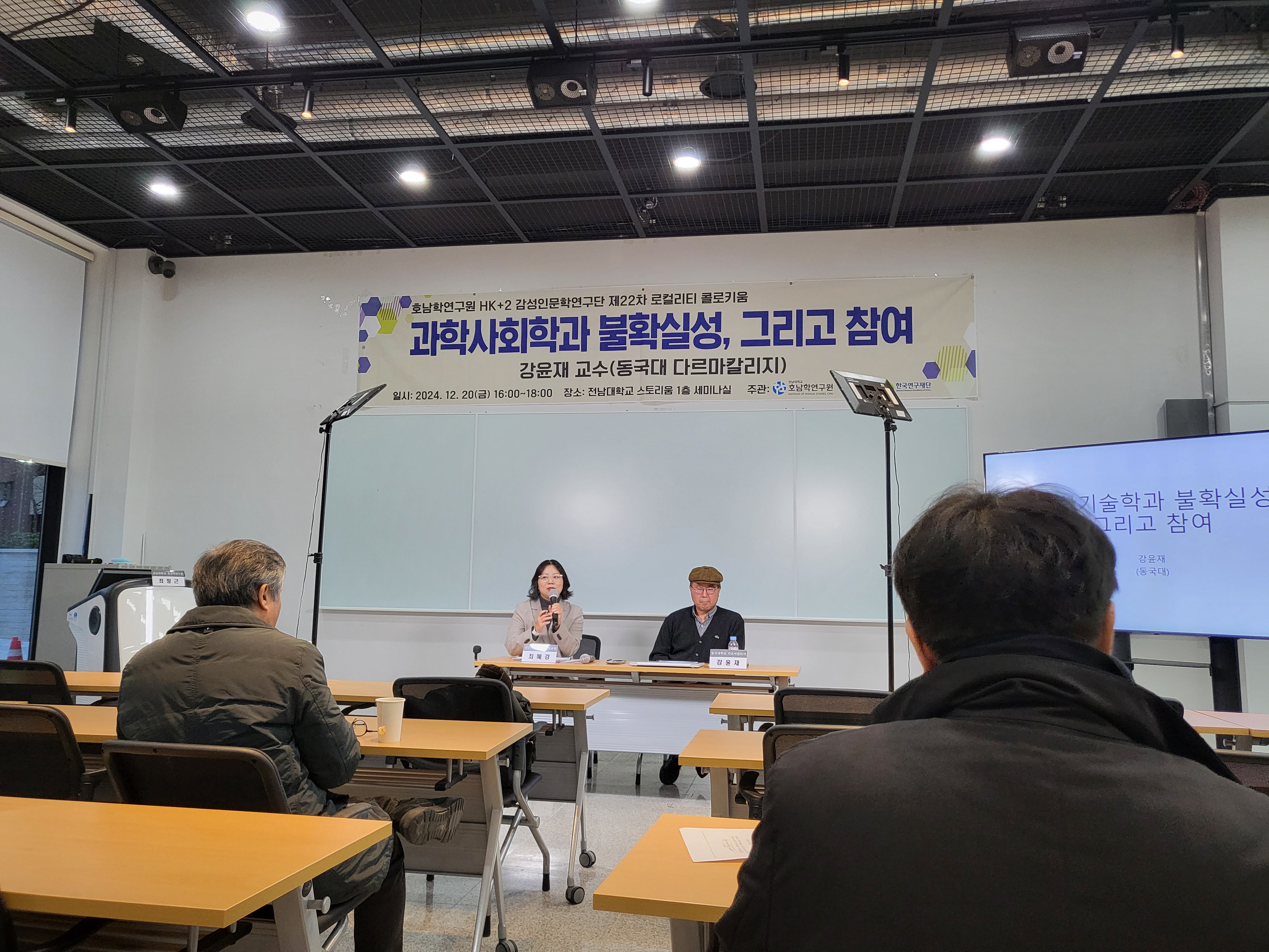 2024년 12월 20일 금요일 전남대학교 스토리움 1층 세미나실에서 개최되었던 제22차 로컬리티 콜로키<과학사회학과 불확실성, 그리고 참여> 행사 사진입니다.