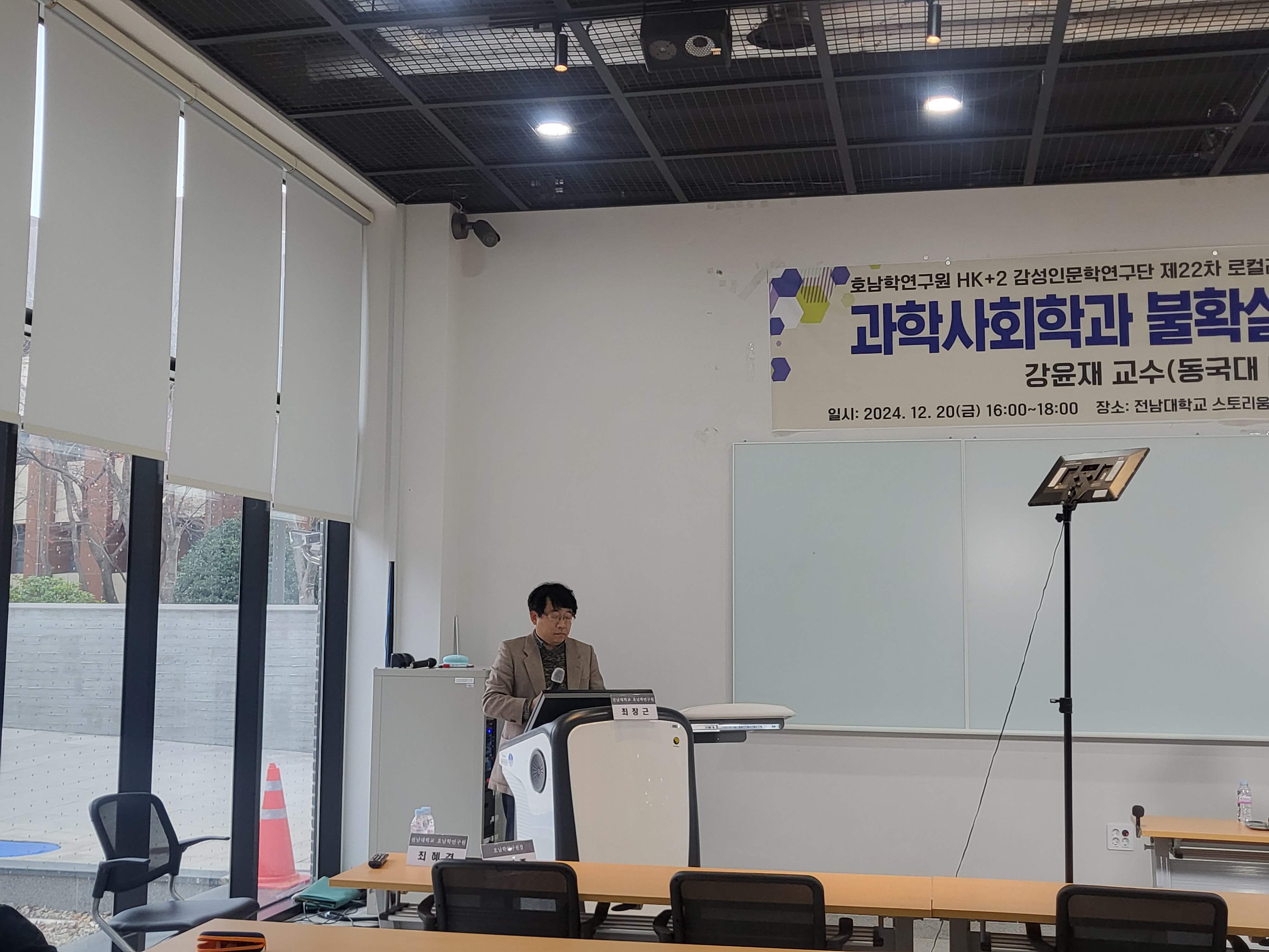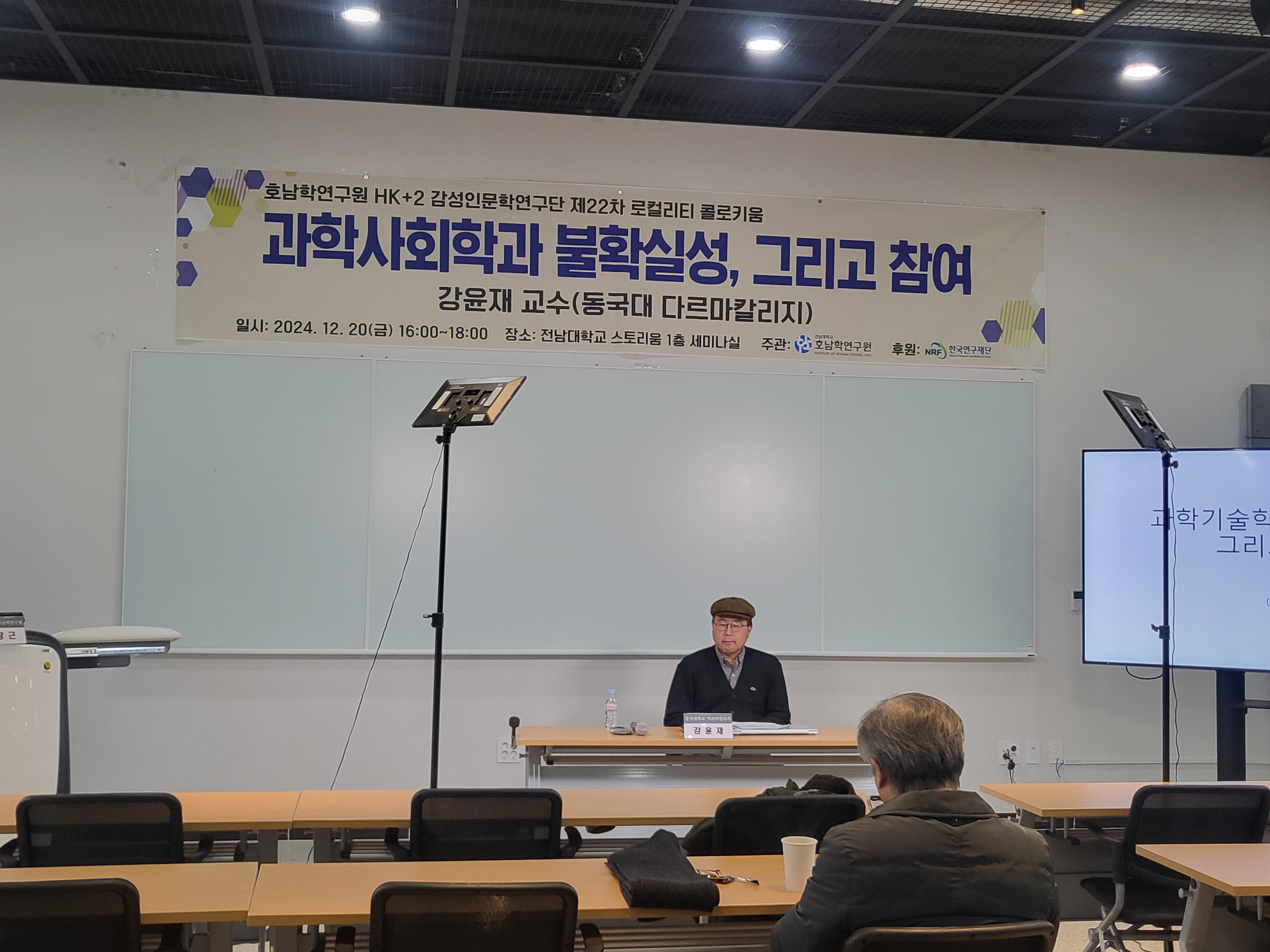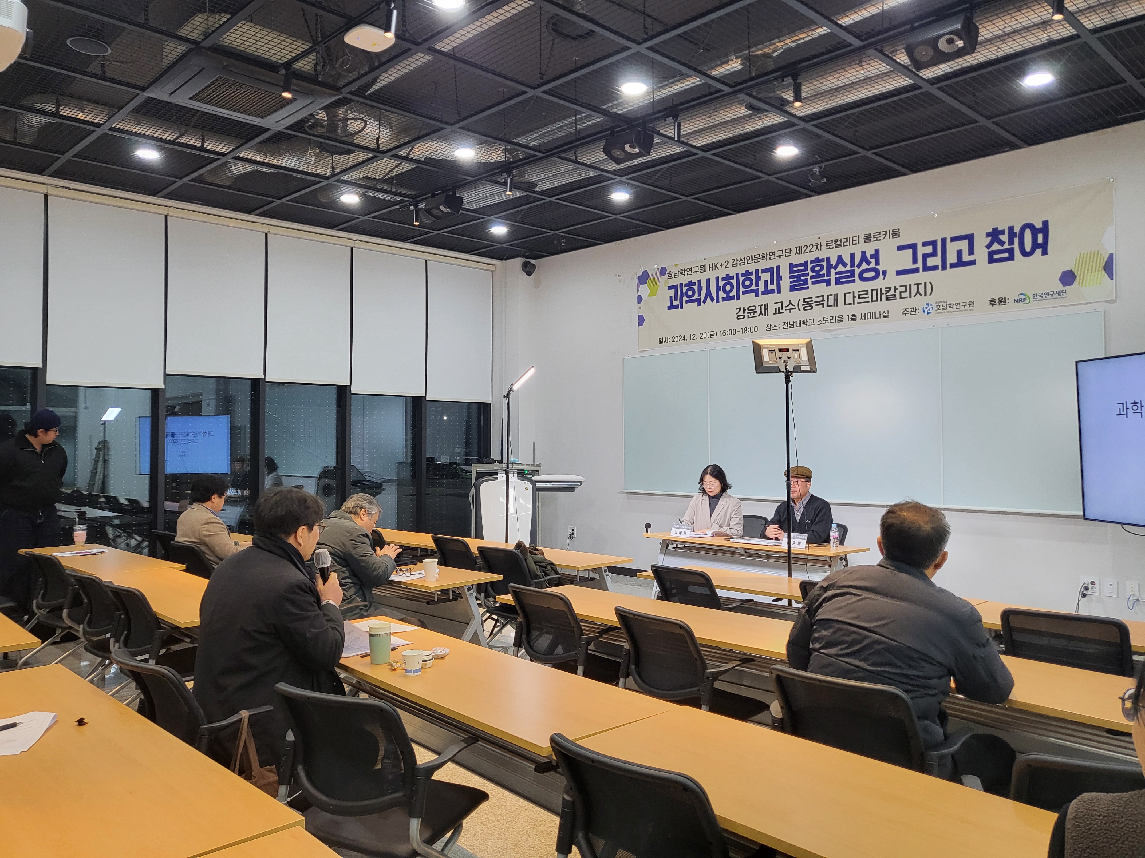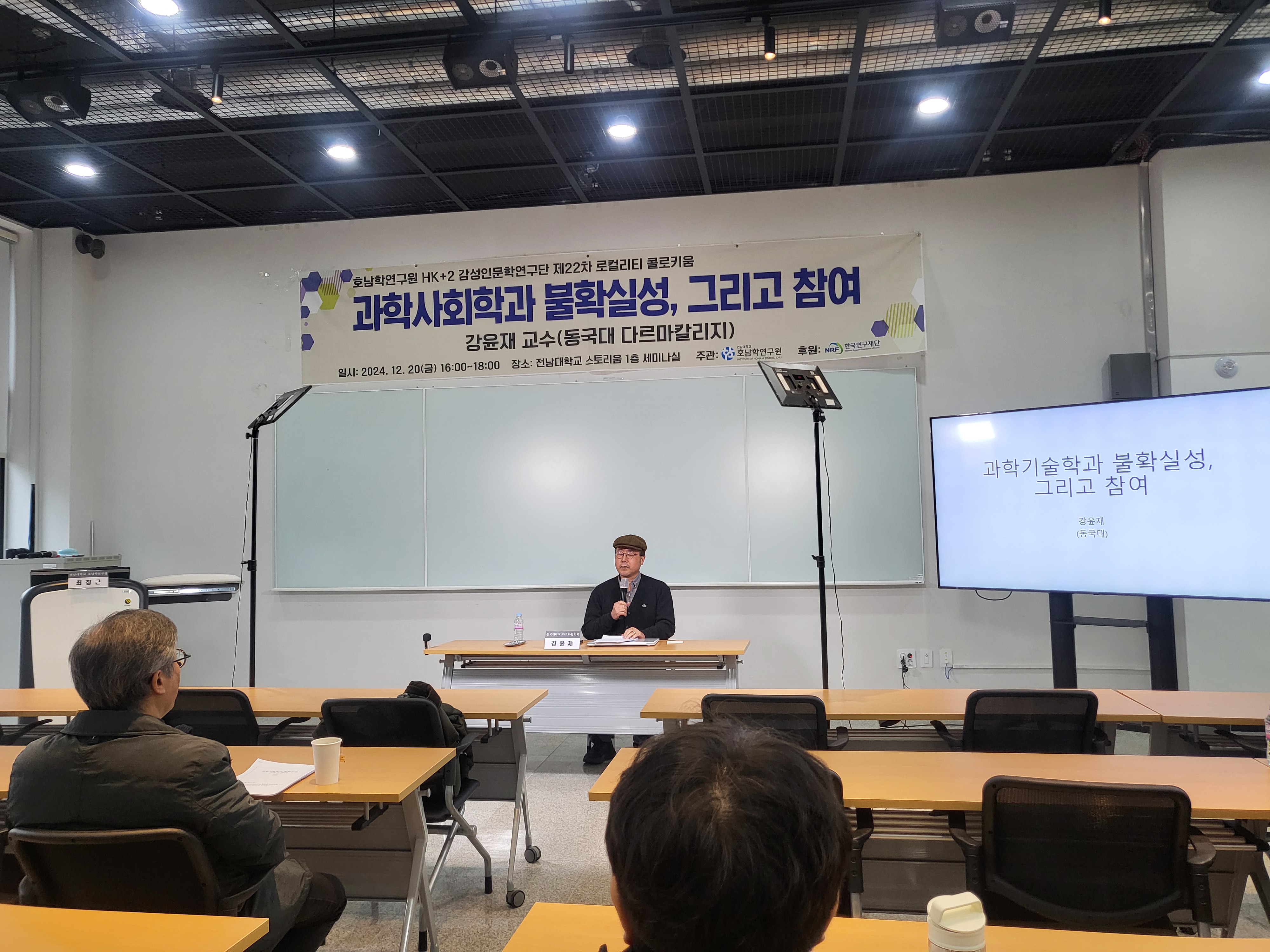 2024년 12월 20일 금요일 전남대학교 스토리움 1층 세미나실에서 개최되었던 제22차 로컬리티 콜로키<과학사회학과 불확실성, 그리고 참여> 행사 사진입니다.
